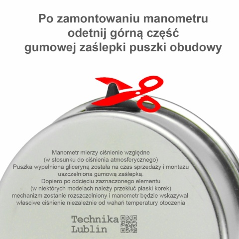 Manometr mierzy ciśnienie względne (w stosunku do ciśnienia atmosferycznego) co wymaga stałego dostępu powietrza atmosferycznego do mechanizmu. Puszka wypełniona gliceryną została na czas sprzedaży i montażu uszczelniona gumową zaślepką. Dopiero po odcięciu zaznaczonego na obrazku elementu korka, mechanizm zostanie rozszczelniony i manometr dopiero wtedy będzie wskazywał poprawne ciśnienie niezależnie od wahań temperatury otoczenia. Niektóre modele wyposażono w płaski korek, który należy po zamontowaniu przekłuć.