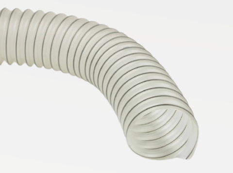 Wąż poliuretanowy zbrojony drutem stalowym sprężynowym galwanizowanym. Wąż przeźroczysty, giętki, doskonale elastyczny, trudnościeralny i antystatyczny. Zalecany do wentylacji i odciągu drobnych materiałów ściernych w podwyższonej temperaturze, przesyłania i odciągu pyłów, trocin, wiórów i innych drobnocząsteczkowych materiałów o temperaturze do 110°C w ruchomych instalacjach odciągowych i odpylających.