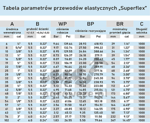 Minimalny promień gięcia dla poszczególnych średnic został uwzględniony w tabeli (kolumna BR),